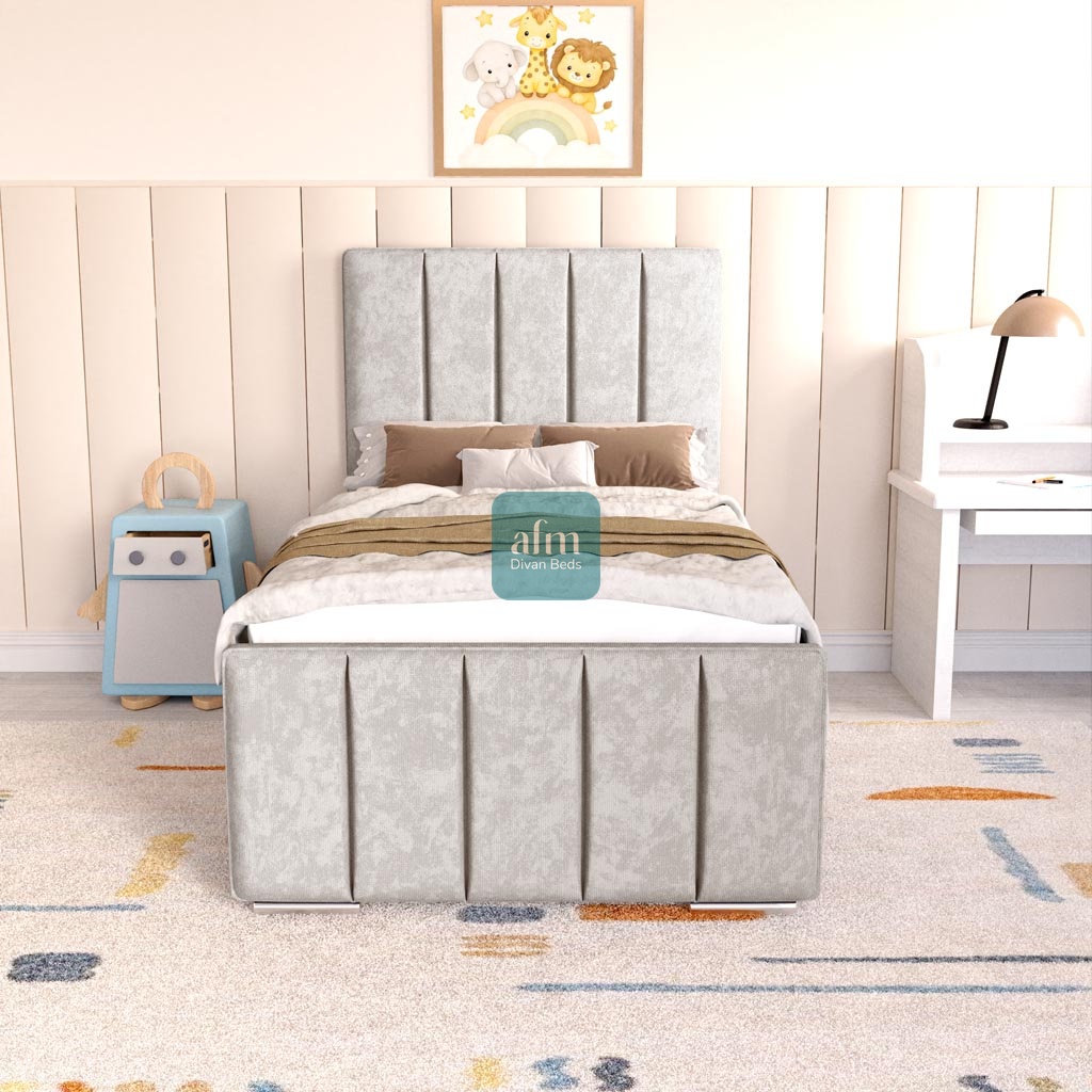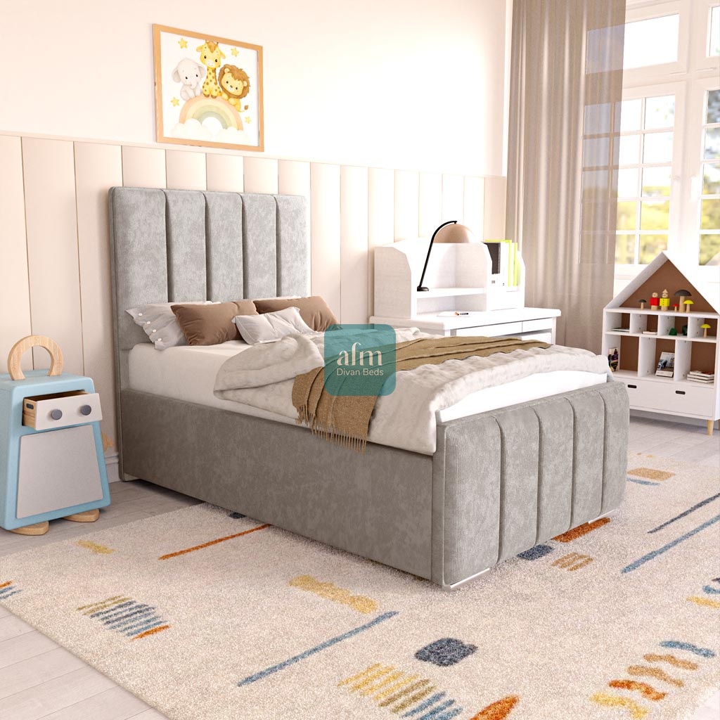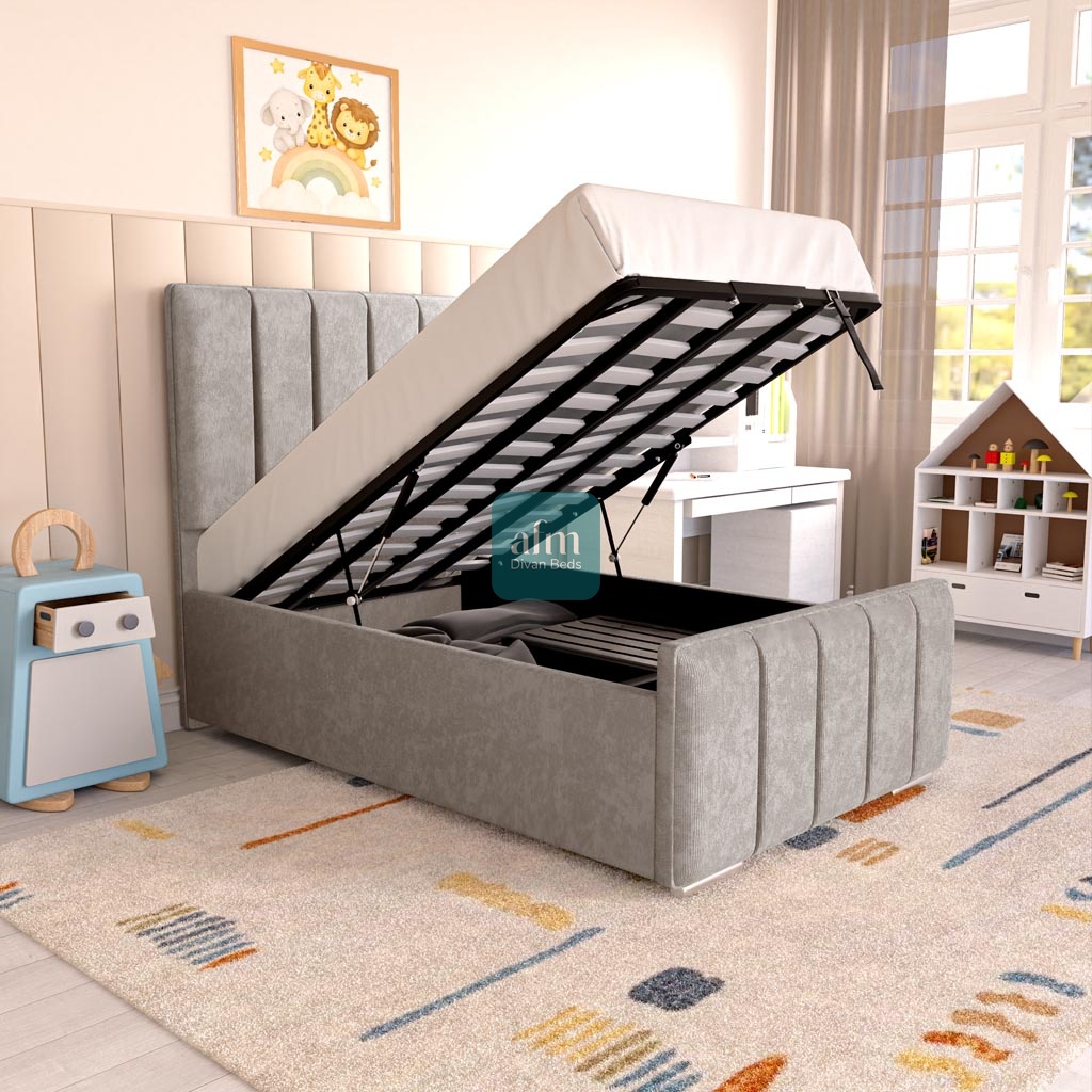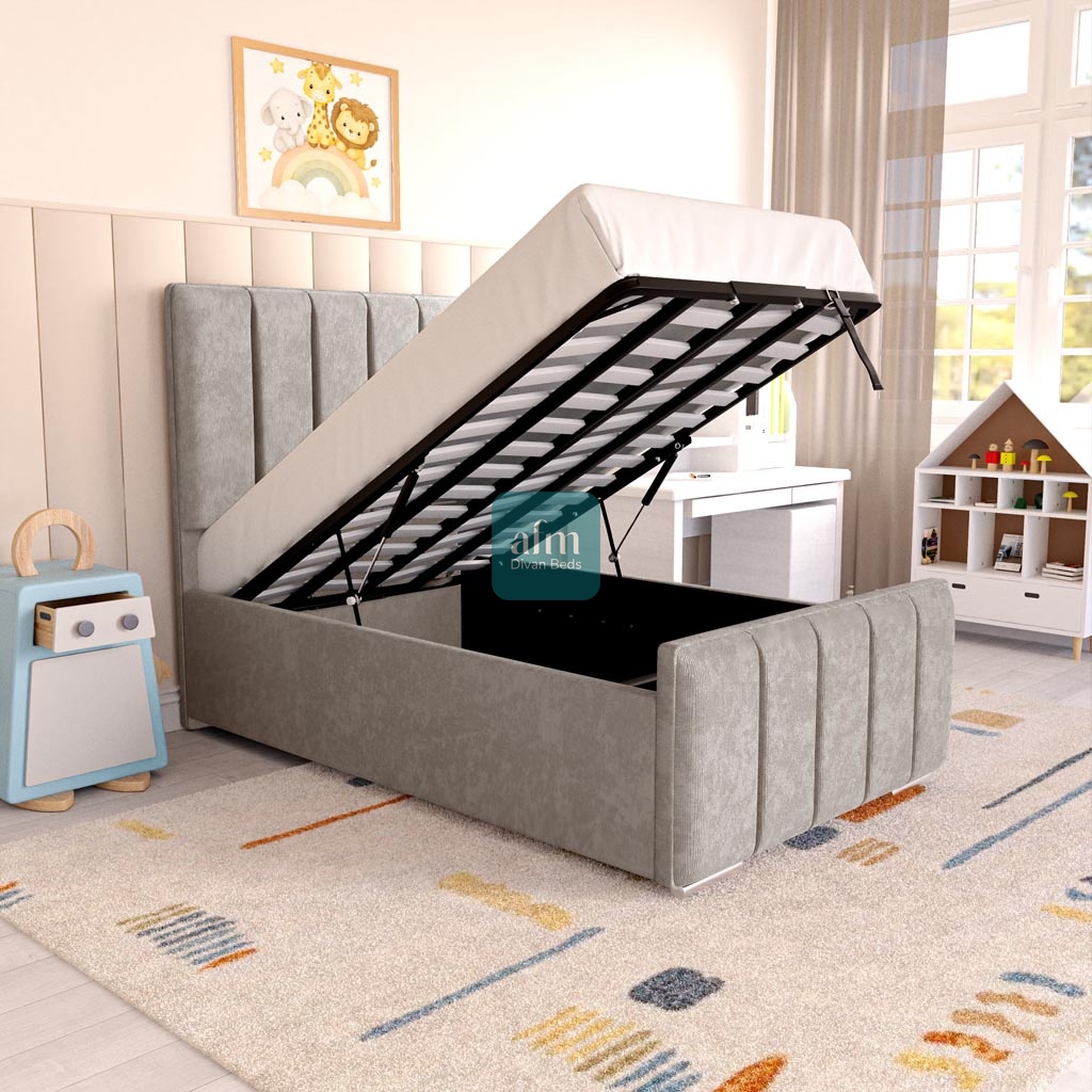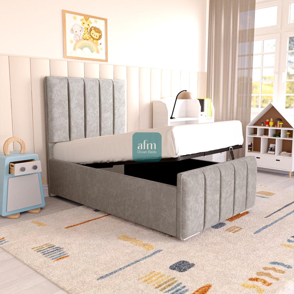 AFM Divan Beds Lisbon Kids Upholstered Ottoman Bed provides comfort and useful storage space for childrens rooms. Available in multiple sizes and colours.